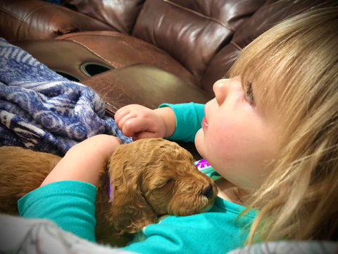 2. We carefully pair our parents based on DNA (and other factors) to ensure that each litter will have curly coats and the proper doodle furnishings, aka the "doodle look". Without properly pairing parents based on DNA then it is possible to get straight haired horribly shedding puppies, even in the later generations of Goldendoodles. We take great care to make sure this never happens by DNA testing for coat type and furnishings. We pair the correct parents together to give you the best puppy!